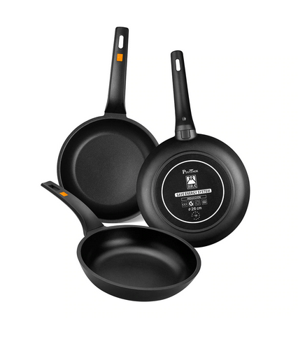 Son de la marca Efficient Bra, fabricadas en resistente aluminio de la mejor calidad, un material que además tiene la capacidad de conservar el sabor de los alimentos. Tienen un revestimiento antiadherente interior y exterior totalmente libre de PFOA. Los alimentos no se pegan y la limpieza es muy fácil. Se pueden usar con todo tipo de cocinas: fuego, vitrocerámica, inducción; y se pueden lavar en el lavavajillas sin problema. Además llevan un mango de baquelita termo, muy resistente y ergonómico. El juego de 3 sartenes cuesta 69,96 €.