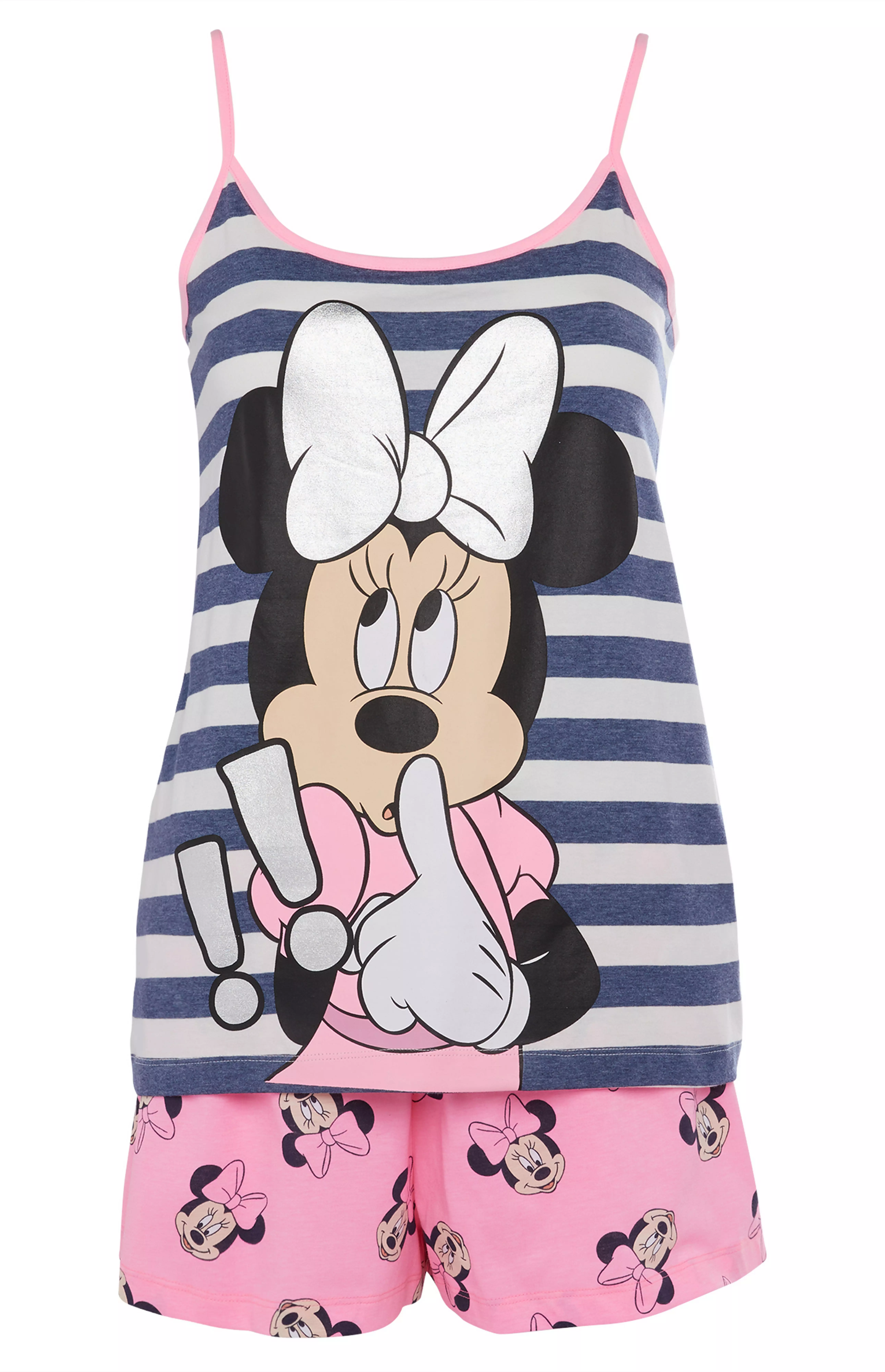 En la misma línea nos encontramos con este pijama de Minnie Mouse. También se trata de un dos piezas compuesto de camiseta de tirantes y pantalón corto, ideal para esas casas con una buena calefacción en la que resulta insoportable abrigarse más. En esta ocasión, el estampado también tiene un aire nostálgico pues se trata de un pijama de Minnie Mouse, el mítico personaje de dibujos animados de Disney. La camiseta es de rayas azules y un gran estampado de Minnie, y el pantalón / short es de color rosa con el rostro de la famosa amiga de Mickey. Disponible en todas las tiendas Primark por tan solo 8 euros.