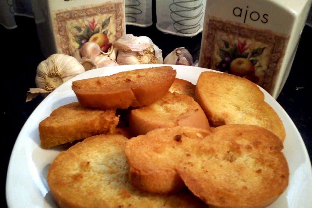 Ponemos el aceite en la sartén y cuando esté caliente freímos bien el pan. Cuando está dorado, como un picatoste, lo sacamos y lo reservamos. Dejamos un poquito del aceite sobrante en la sartén y cuando vuelva a estar caliente freímos los ajos y la cebolla picada, dando vueltas con una cuchara de madera. Añadimos entonces el pimentón, apartando momentáneamente la sartén del fuego para que no se queme, y removiendo bien. Entonces colocamos el pan, que teníamos apartado, en una cazuela de barro y le echamos por encima el aceite con la cebolla y el pimentón (el ajo lo hemos retirado y ya no nos sirve para nada más, era tan solo para darle sabor).