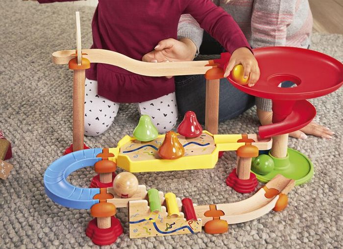 En la cadena alemana se pueden encontrar las tradicionales pistas de bolas infantiles, como este modelo de música en el que los niños pueden entretenerse jugando en una pista con torre de saluda, embudo, circuito con campanillas y escaleras de xilófono. Sus rieles son de madera de haya y su precio es de 19,99 euros.