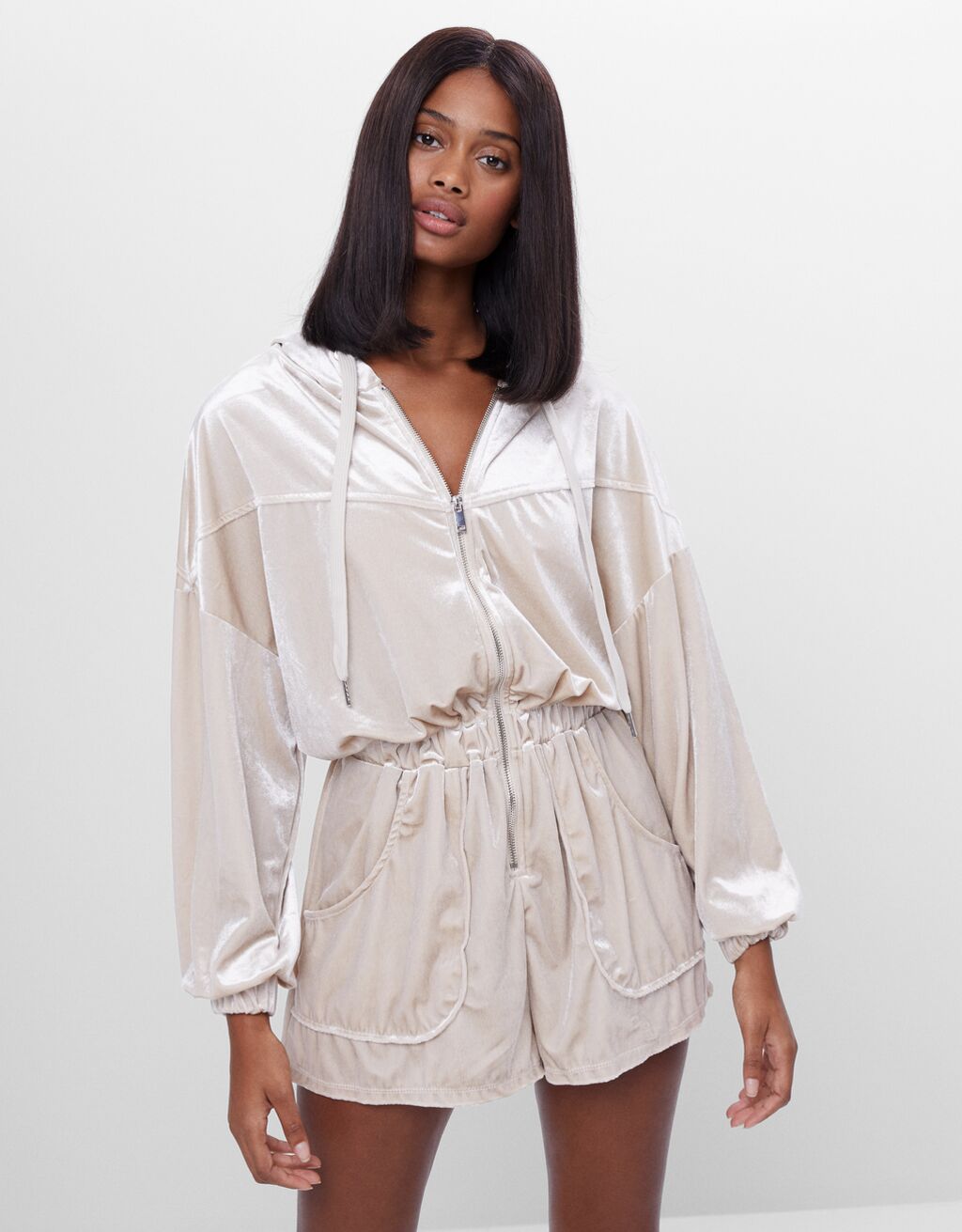 Si buscas algo original que te haga destacar sobre los demás, este mono de terciopelo es perfecto para ti. Un punto de color e innovación en ese mar de prendas oscuras y neutras que se suelen ver en el invierno. Tiene un diseño similar a los monos tradicionales de trabajo, pero adaptados al entorno urbano, de pierna corta y de un tejido de suave terciopelo brillante de color beige.