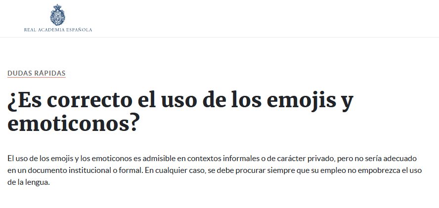 Pues bien, ya tienen tanta importancia y forman parte de nuestras vidas, que la misma RAE ha tenido que dar su opinión sobre ellos. «El uso de los emojis y los emoticonos es admisible en contextos informales o de carácter privado, pero no sería adecuado en un documento institucional o formal”, esto es lo que han dicho. Es decir, que para tu WhatsApp o redes bien, pero nada de usarlo en textos oficiales o de importancia. Por ejemplo tampoco se recomienda su uso en Linkedin.