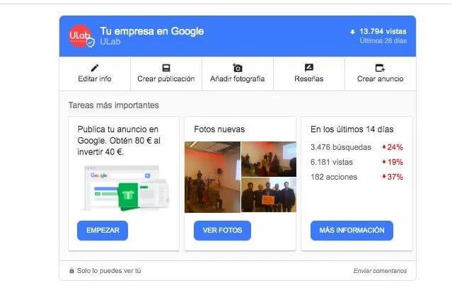 Para ello te tienes que crear un perfil y poner todos los datos. Luego, siguiendo unos consejos puedes tener más opciones o menos. Y está claro que si pagas más o menos, Google te puede ofrecer más herramientas para hacerte un hueco en el extenso mundo del posicionamiento para tu negocio on line.