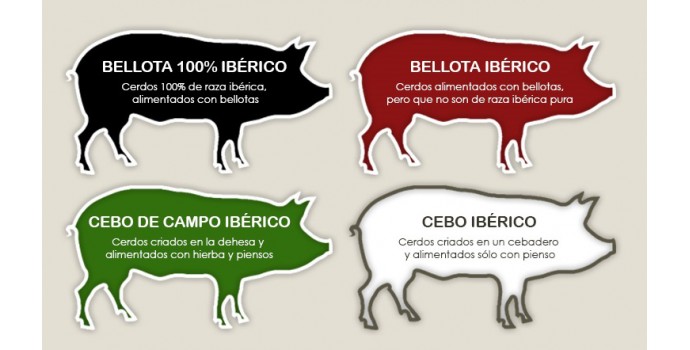 Una vez tengas clara la tipología de jamones y las recomendaciones para conseguir un jamón ibérico de calidad, vamos a ayudarte a entender el etiquetado. Así irás sobre seguro. Hay cuatro colores en el etiquetado del jamón: negro, rojo, verde y blanco. La etiqueta negra es la reservada para el jamón de bellota 100% ibérico. Es decir, estos jamones, corresponden a cerdos que reúnen las características que antes hemos detallado: han sido criados en libertad en las dehesas y alimentados de pastos naturales, hierbas y bellotas. Es el mejor jamón, desde luego, pero también el más caro. Bajo la etiqueta roja nos encontramos jamones de bellota ibéricos, pero cruzados, es decir, no son 100% ibéricos. Bajo la etiqueta verde, nos encontramos jamones que proceden de cerdos alimentados de pastos naturales pero que pueden ser o no ser ibéricos (el porcentaje de cerdo ibérico debe incluirse en el etiquetado y va del 100% al 50%). Por último, la etiqueta blanca nos dice que estamos ante un jamón de cebo ibérico.