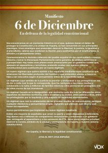 El manifiesto recuerda que el 6-D se conmemora «la decisión soberana del pueblo español de dar continuidad a nuestra Historia y tomar la Monarquía Parlamentara como garantía de unidad, convivencia y prosperidad» para advertir que «todos esos pilares están amenazados por un gobierno traidor que, apoyado en separatistas y terroristas, pretende acabar con nuestro sistema constitucional para sustituirlo por un nuevo régimen».