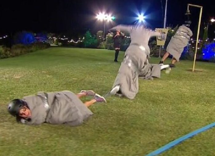 En la prueba, las parejas estaban envueltas en un edredón, con uno de sus pies atados al de su compañero. Debían escuchar una canción y, en el momento que la música parase, debían correr hacía el otro lado de la pista, tocar una campana y decir el título de la canción.