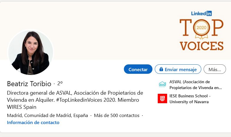 Es la actual directora general de ASVAL, Asociación de Propietarios de Vivienda en Alquiler. Y su nombre ya está en el #TopLinkedinVoices 2020 al ser miembro WIRES Spain. En un sector tan vital como el inmobiliario, es el alma de poner en marcha y dirección de la primera asociación en España que representa a los principales agentes relacionados con el mercado del alquiler, desde grandes operadores a pequeños propietarios.