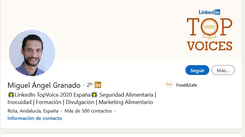 Su nombre es Miguel Ángel Granado y su principal reto profesional es, como dice en su perfil de Linkedin, “mejorar la inocuidad, seguridad y calidad en los productos alimentarios”. Es un apasionado incondicional de mi profesión, pero también disfruta muchísimo dando un paseo por la playa en pleno invierno o dibujando con carboncillo y acuarelas. Por esta cercanía se convertido en una de las voces más relevantes de la red social y ha entrado en el LinkedIn TopVoice 2020 España.