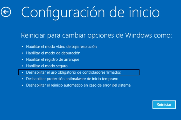 Tienes que mantener pulsada la tecla mayúsculas mientras que reinicias el sistema. Una vez reiniciado entrarás en un modo especial de Windows 10. Como ves en una especie de modo Dios, que ya te hemos contado. Luego selecciona Solucionar Problemas – Opciones Avanzadas – Configuración de Inicio. Y por último, reinicia el sistema para deshabilitar el uso obligatorio de controladores firmados.