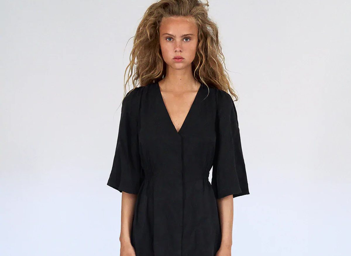 Es un vestido corto de escote pico y manga corta que tiene detalle de elásticos en cintura y cierre delantero con botones ocultos por solapa. Está confeccionado en 100% fibra liocel, siendo parte del programa de Inditex de la apuesta por tecnologías y materias primeras enfocadas a reducir el impacto medioambiental.