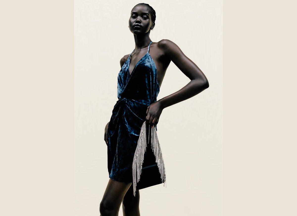 Para finalizar nuestra selección de vestidos de fiesta de Zara a precios de saldo traemos este vestido mini terciopelo de color azul pato. Confeccionado en poliéster (93%) y elastano (7%), está a la venta por 19,95 euros.