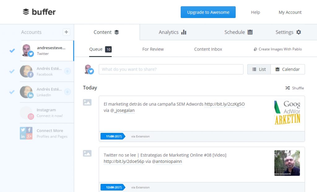 Buffer es una alternativa muy recomendable si no quieres usar Hootsuite. Es muy práctica para usuarios individuales si usas la versión gratis. Mientras que una versión pro te permite agregar hasta 8 cuentas de redes sociales, cuesta alrededor de 10 euros al mes. Entre sus ventajas está que la herramienta de agenda permite una planificación innovadora de las entradas en las redes sociales.