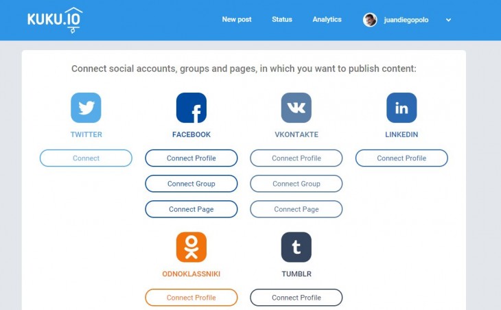 Kuku se lanzó en el año 2015. El programa ofrece la posibilidad de programar posts en un buen número de redes sociales: Facebook, Twitter, Pinterest, Tumblr y LinkedIn, así como las redes rusas vk.com y ok.ru. No tiene la calidad de Hootsuite, pero centra sus funciones en escribir o compartir publicaciones de forma rápida y dinámica.