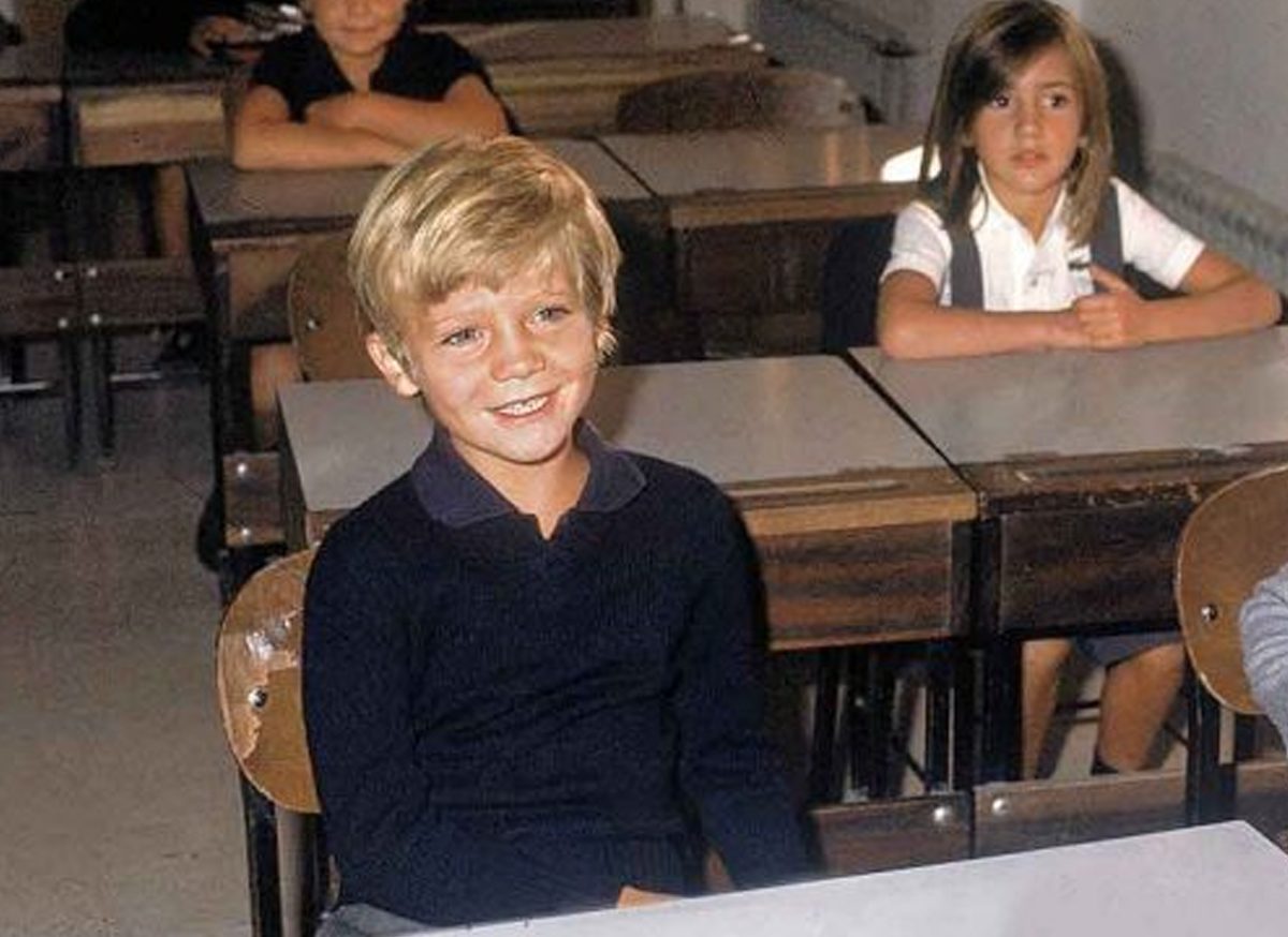 Allí recibió una formación académica similar al del resto de sus compañeros, sin que tuviese ninguna concesión adicional por ser miembro de la Familia Real. Esta imagen muestra a un Felipe VI que posa sonriente ante las cámaras sentando en un pupitre junto a una compañera y otros alumnos al fondo. Por aquel entonces lucía una cabellera muy rubia