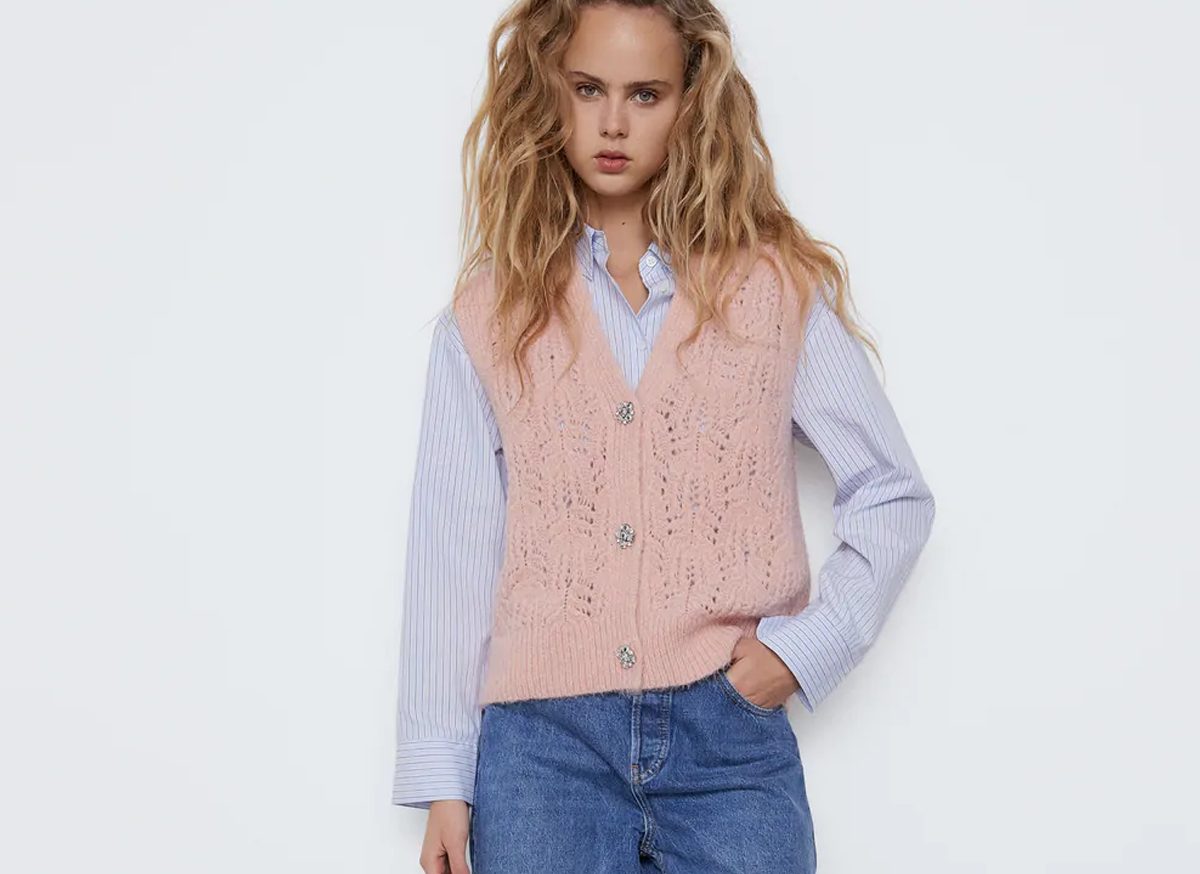 Los chalecos de punto son cada vez más populares, siendo una tendencia que se mantiene desde hace años. Uno de los modelos más interesantes de Zara es el chaleco punto botón joya, confeccionado en acrílico, poliamida y poliéster en un color rosa pastel que puede llegar a darte el toque que necesitas en tu outfit.