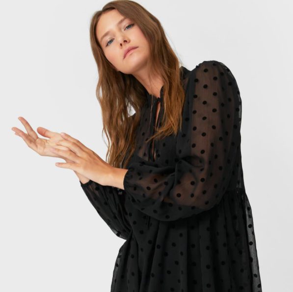 Las prendas clásicas también tienen cabida en el catálogo de Stradivarius. Si buscas un vestido que, además de usar para una fiesta, también te pueda sacar de más de un apuro, este de topos es de las mejores opciones.
