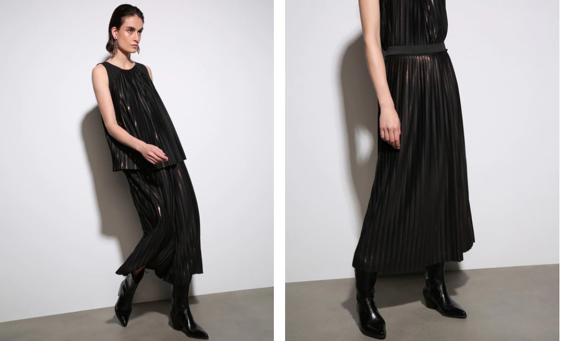 Hablamos de esta falda plisada con brillos, en un elegante color negro, solo apta para las más sofisticadas. Además, tenemos la posibilidad de convertirla en una especie de traje, pues podemos adquirir también la parte de arriba a juego.