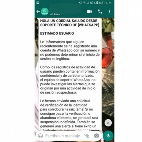 En el texto indican que alguien habría registrado una cuenta de WhatsApp con el mismo número de teléfono de la víctima. Hablan de que no pueden determinar si hay un “inicio de sesión ilegítimo”. “Le hemos enviado una solicitud de verificación de la identidad para corroborar la raíz [SMS). Si la víctima envía ese código a los hackers perderá al momento el control de su cuenta y estará cediendo su usuario. Así que mucho cuidado.