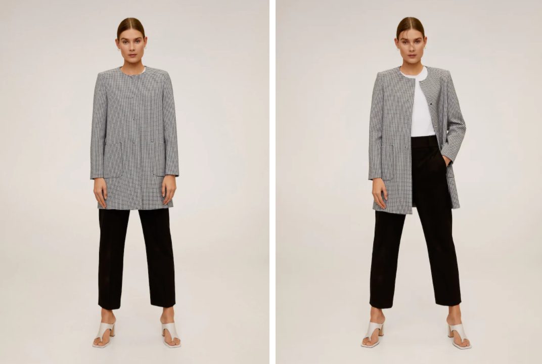 Así, muy similar a la opción anterior, encontramos este abrigo recto con uno de los estampados que mejor quedan: el de pata de gallo. En blanco y negro, no habrá combinación que se nos resista si queremos ser las más elegantes.