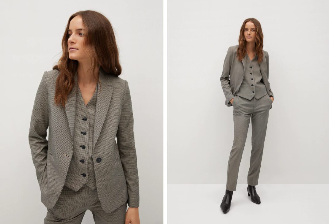 Nos referimos a esta chaqueta, en estampado pata de gallo en versión mini, que también cuenta con pantalón a juego. La podemos encontrar tanto en marrón como en gris y ambas opciones quedan igual de elegantes.