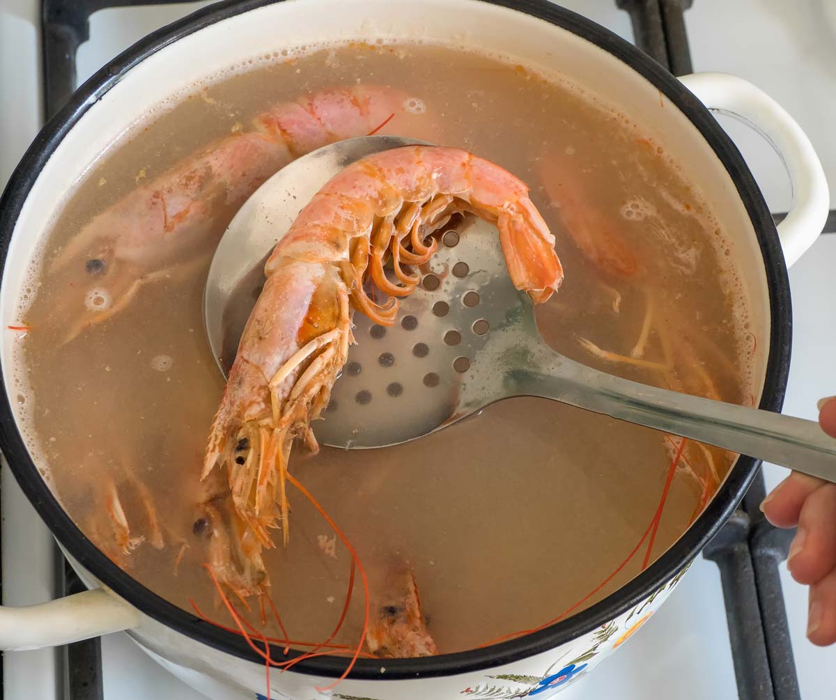 Pon a calentar una buena cantidad de agua con un poco de sal y en cuanto hierva añade los langostinos ya pelados y descongelados. El tiempo de cocción de los langostinos depende de su tamaño, aunque suele ser muy rápido, unos pocos minutos. Una vez hechos cuela y sumérgelos en un bol con agua fría para cortar su cocción. Sepáralos y resérvalos para incorporarlos luego a tu sopa de pescado.
