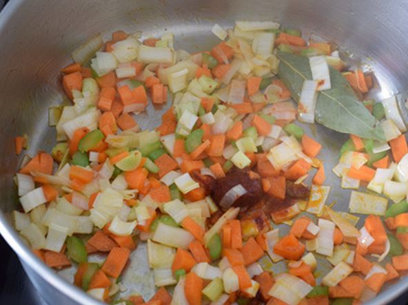 En una olla calienta un chorro de aceite de oliva y añade todas las verduras cortadas anteriormente. Echa unas hojas de laurel y la pulpa del pimiento y deja cocinar todo a fuego medio por aproximadamente 8 minutos. Agrega azafrán, pimentón y riega con el Pedro Ximénez. Espera que se evapore todo el alcohol y cubre con el caldo. Sube un poco el fuego y deja cocer todo unos 10 minutos. Tritura con batidora de mano tipo Minipimer las verduras hasta que se deshagan casi por completo y se forme una salsa espesa.