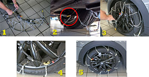 Desabrocha el aro rígido de las cadenas. // Asegúrate de que no están enredadas. // Introduce un extremo por detrás de la rueda. // Coge los dos extremos y comprueba que la cadena no ha quedado aprisionada por la rueda. // Cierra el aro interior por encima de la rueda. // Asegúrate de que queda centrado por detrás del neumático. // Cierra el anillo exterior. // Centra el conjunto de la cadena sobre la zona de rozadura y los flancos del neumático. // Aprieta bien el tensor. // Engancha el sobrante de la cadena para que no quede colgando.