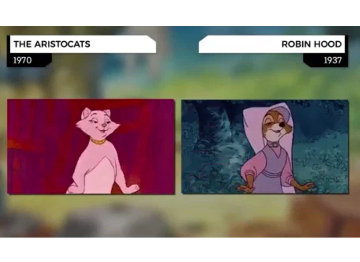 A lo largo de la historia, Disney ha reutilizado pasos de baile de algunos de sus personajes; y lo ha hecho en más ocasiones de las que pudieras imaginar, aunque no te hayas percatado. Un claro ejemplo es el baile de una de las personajes de Los aristogatos (1970), que repite el que ya se había visto con anterioridad en Robin Hood (1937).