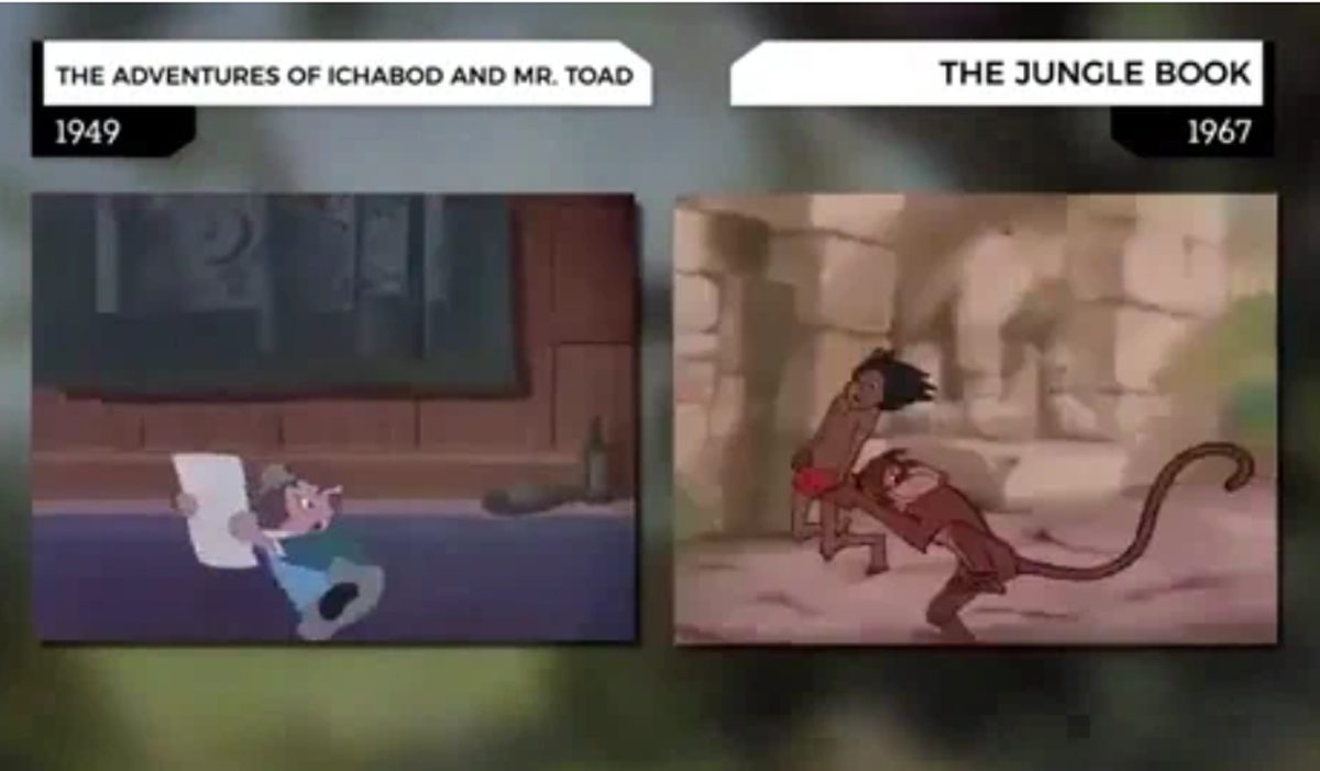 Esta escena, aunque con diferentes personajes es similar a la que se pudo ver dos décadas antes en La leyenda de Sleepy Hollow y el Señor Sapo (1949). En esta última se puede ver cómo en la pelea el Sr. Sapo consigue arrebatar un documento, mientras que en el primero, Baloo ve cómo los monos le arrebatan a Mowgli cuando trataba de escapar con él en brazos.