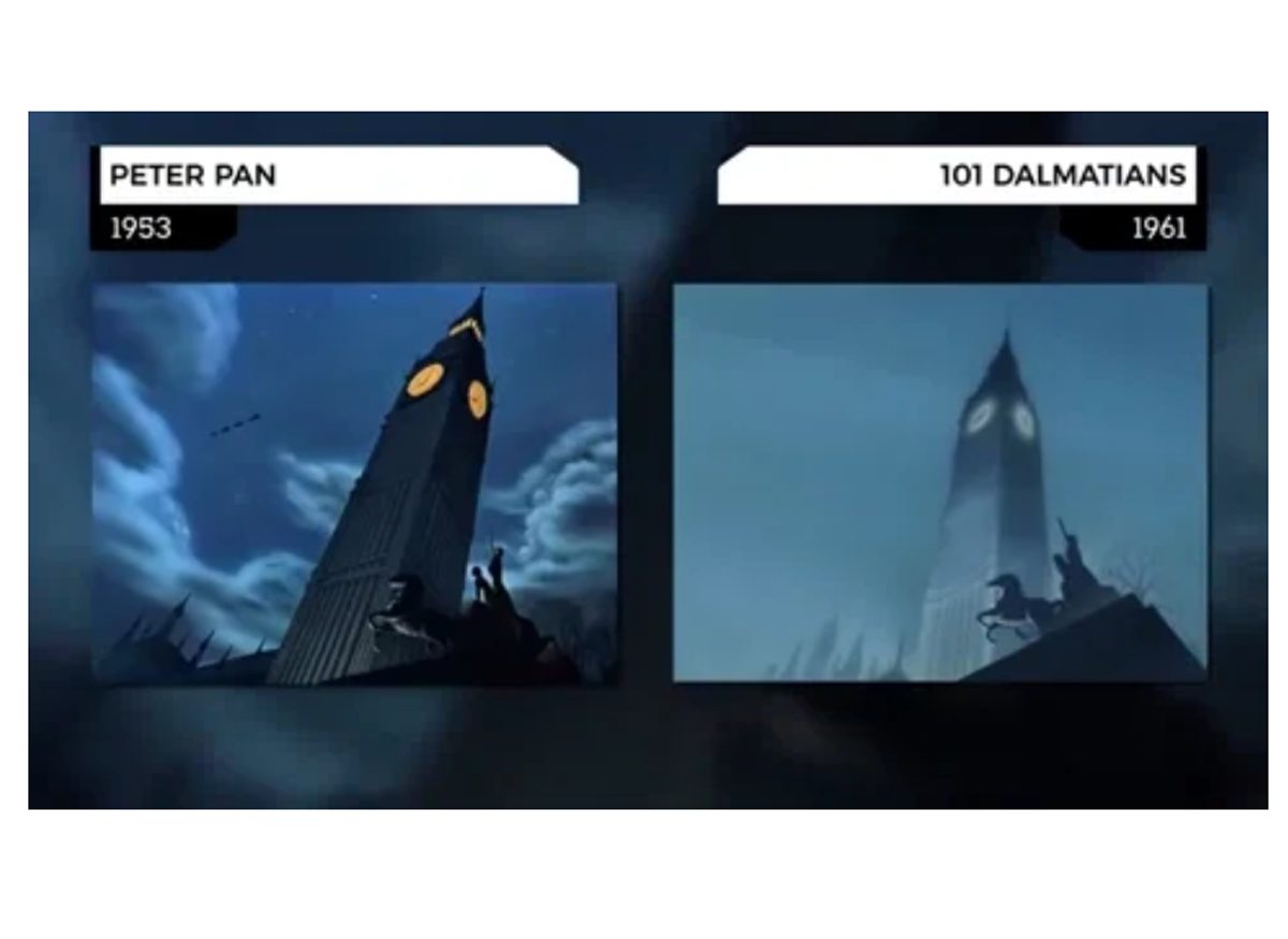 Además de acciones de todo tipo como bailes, peleas, poses…, Disney también ha reutilizado escenarios. Por ejemplo, en Peter Pan (1953) se ve como Peter Pan, Wendy, John y Michael sobrevuelan por el conocido Big Ben de Londres en una de las escenas.