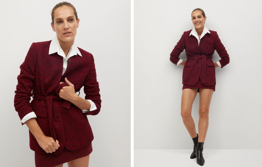 En este caso, desde Mango nos proponen darle una vuelta de tuerca a las opciones más clásicas para optar por una de estampado pata de gallo y un llamativo color rojo. Además, lo mejor es que, también en la tienda, encontraremos la falda a juego, por lo que podremos construir un bonito conjunto.