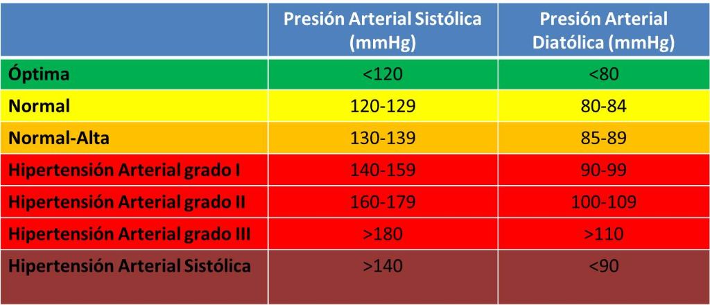 La Normal entre 130 y/o diastólica inferior a 85. La Normal-alta si tenemos la presión arterial sistólica entre 130-139 y/o diastólica entre 85-89. Mientras que eres Hipertensión grado 1: si tienes una presión arterial sistólica entre 140-159 y/o diastólica entre 90-99. Hipertensión grado 2: presión arterial sistólica entre 160-179 y/o diastólica entre 100-109.Y por último, Hipertensión grado 3: presión arterial sistólica igual o superior a 180 y/o diastólica igual o superior a 110.