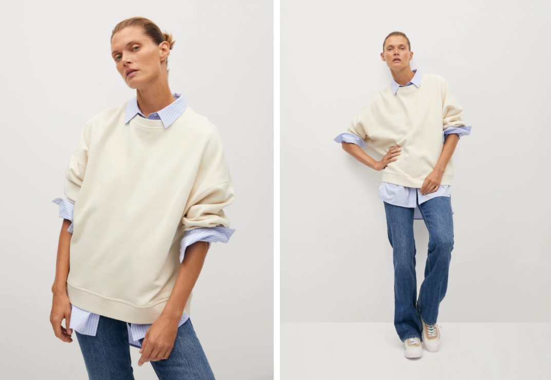 Esta es la idea que nos propone Mango de la mano de esta sudadera oversize en un bonito color hueso. También está realizada en algodón, igual que la anterior y la podemos encontrar con una rebaja interesante.