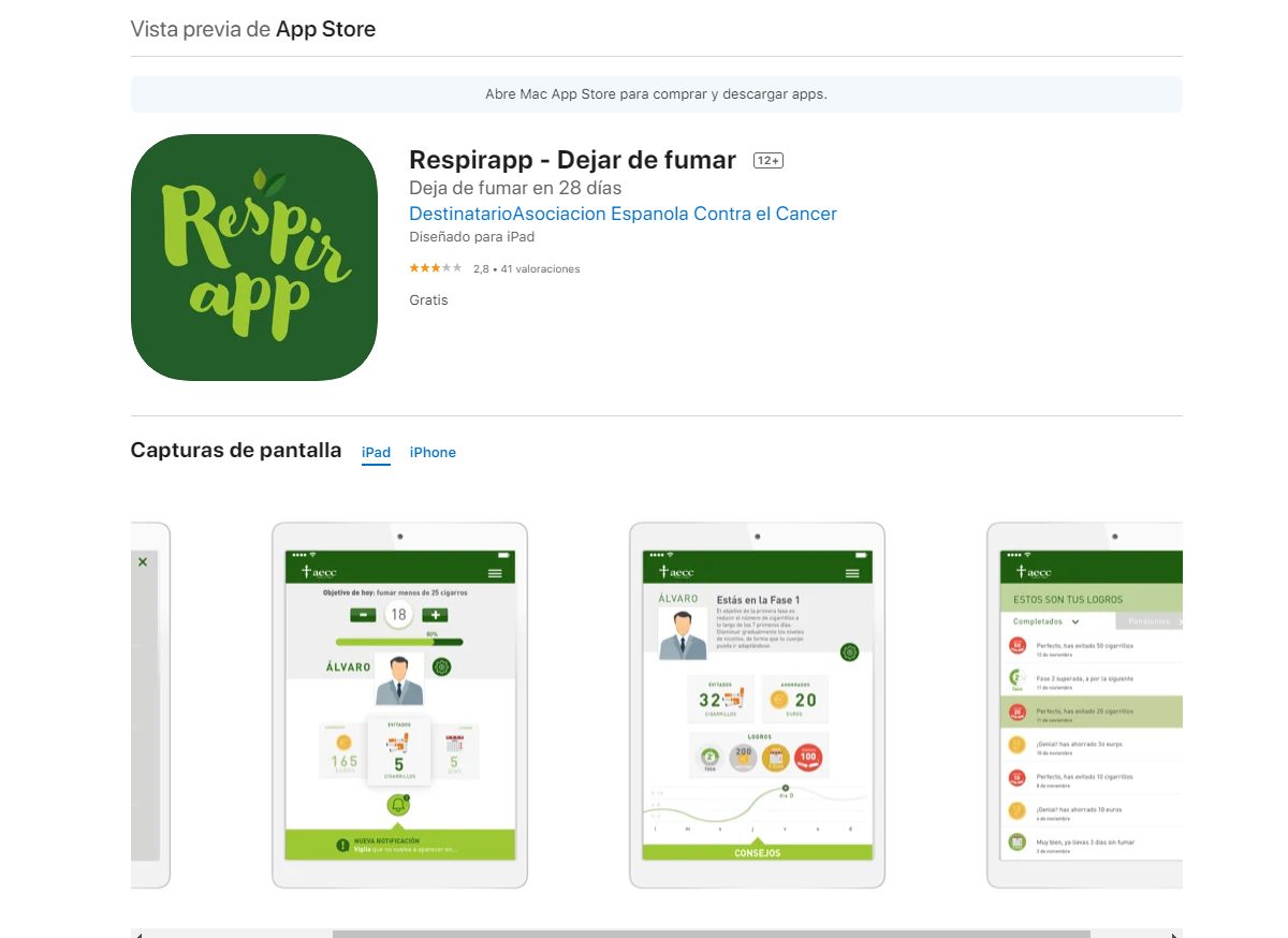 La Asociación Española Contra el Cáncer también cuenta con una aplicación gratuita a modo de guía de orientación que apoya a las personas interesadas en dejar el tabaco a través de cuatro fases. A través de la app se recibirá un asesoramiento y apoyo continuado buscando así que se logre dejar de fumar en 28 días.