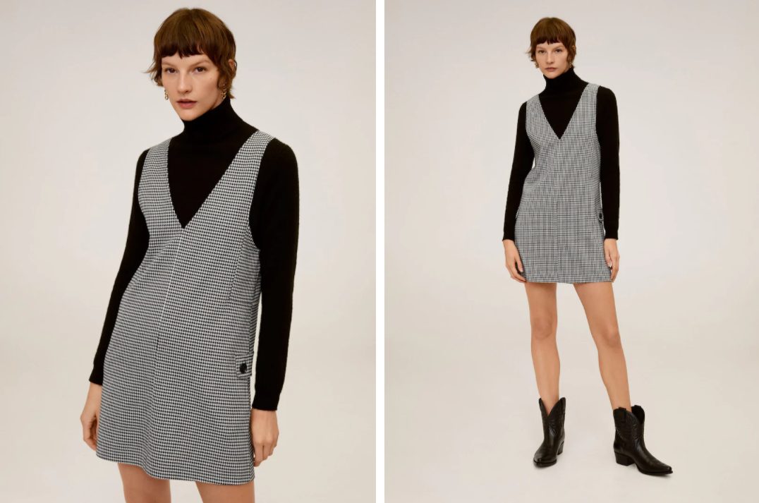 Lo mismo que con los petos nos sucede con otra prenda de la que te enamorarás nada más ver cómo queda: el pichi. Con un estilo más sobrio y clásico, una de las mejores opciones que podemos encontrar en las tiendas es este de Mango, con un delicado estampado de pata de gallo.