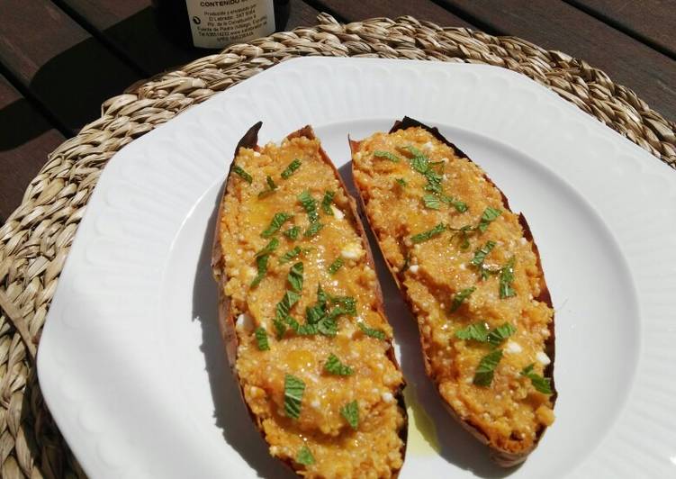 Nuestra primera receta es un boniato asado relleno de quinoa y queso. Algo que suena muy bien. Lo que tenemos que hacer es lavar bien los boniatos y cortarlo por la mitad. Cocer al vapor durante unos 30-40 hasta que queden tiernos. Luego cocinamos la quinoa. Más tarde mezclar con el queso y las especias.