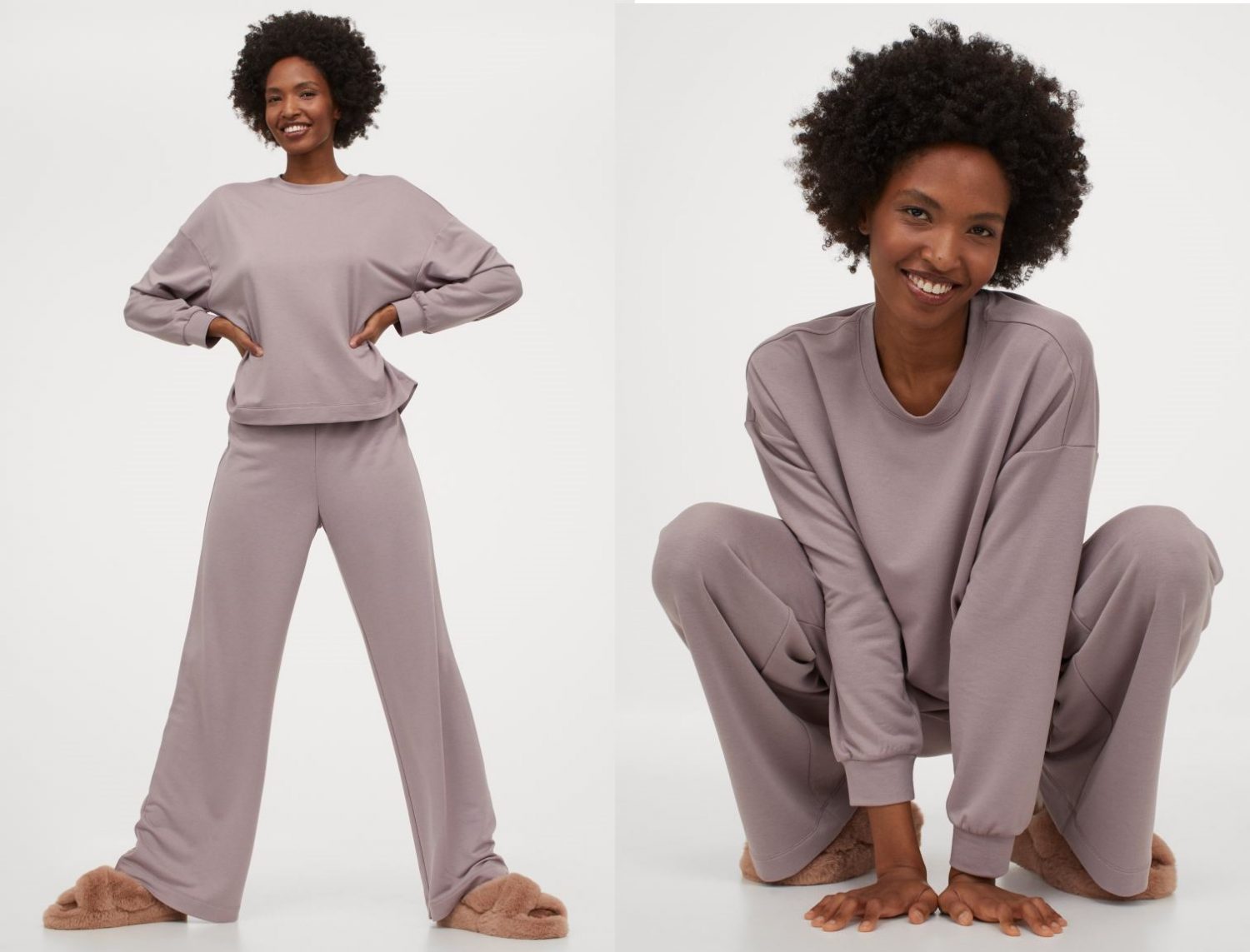 ¿Quién diría que este es un pijama? Lo cierto es que pasaría por un pantalón cómodo, que lo es de estar en casa, y una sudadera. Pero la verdad es que se trata de una de esas combinaciones de H&M que están triunfando y no es para menos. Con un color suave en tono malva nos ha cautivado a primera vista.