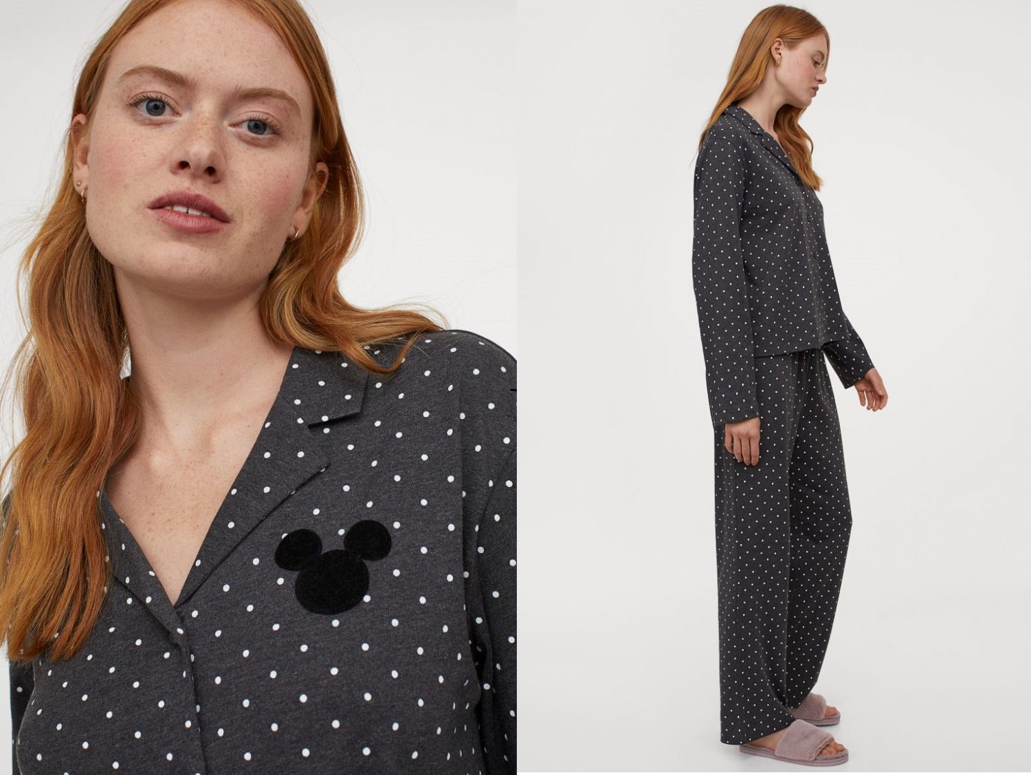 Por un lado tenemos la parte superior en forma de camisa que tanto nos gusta. Con sus solapas y además, un detalle en felpa que es un claro homenaje a Mickey Mouse de nuevo. Su pantalón también es recto pero igual de cómodo. A todo ello se le añaden los detalles de los lunares, que es de esos estampados que tampoco pasan de moda. ¿A qué te ves con un pijama H&M así?