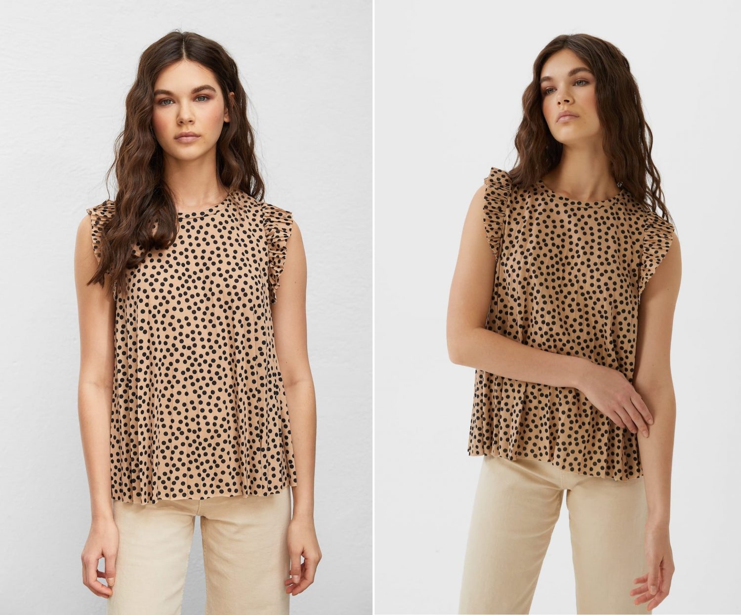 La comodidad también se posiciona en ella, porque como vemos, apuesta por un estilo flojo o maxi, como hoy lo conocemos. Eso sí, con un toque fruncido en la parte de los hombros y con un estampado de lo más alegre. ¿No te parece una gran idea para estrenar próximamente?