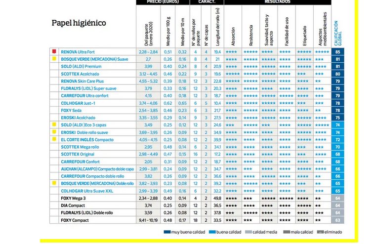 En el puesto 11 Solo (Aldi) eco 3 capas: 74 puntos. 12 Eroski doble rollo suave: 74. 13 El Corte Inglés compacto: 72. 14 Scottex mega rollo: 70. 15 Scottex original: 68. 16 Carrefour confort: 68. 17 Auchan (Alcampo) compacto doble capa: 66. 18 Carrefour compacto doble rollo: 66. 19 Bosque Verde (Mercadona): 65. 20 Colhogar ultra suave XXL: 65. 21 Foxy mega 3: 64 puntos. 222 Dia compact: 64 puntos. 23 Floralys (Lidl) doble rollo: 64 y 24 Foxy compact: 63 puntos.