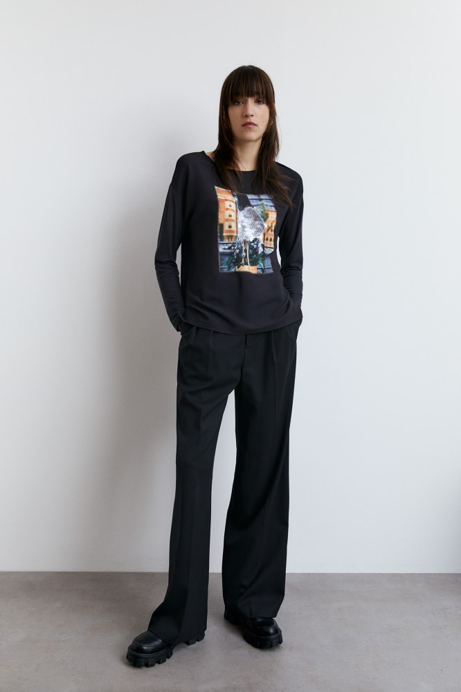 Si tu look es más urbano pero no por ello deseas dejar de lado la elegancia, en Sfera también encontrarás la prenda perfecta para ti. Un claro ejemplo lo tenemos en esta camiseta gráfica en color negro que llama la atención.
