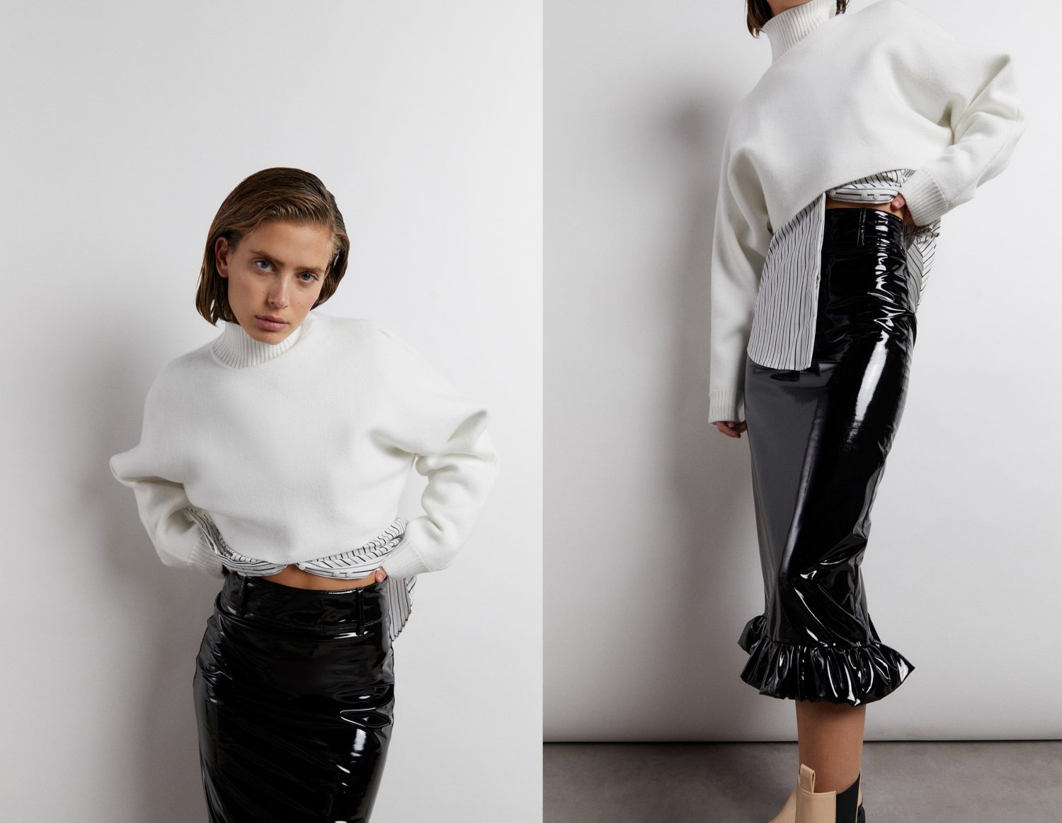 En este caso se trata de una falda que cuenta con ese brillo, propio del vinilo. Pero que además, se completa con un corte recto o de lápiz y como no, con un volante en la parte baja de la misma. ¡No le falta detalle como podemos comprobar!