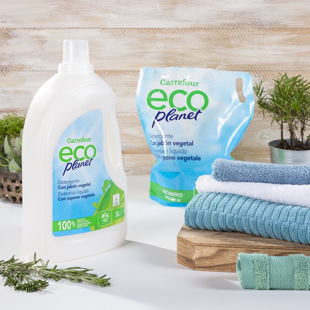 Por otro lado, el estudio de la OCU también analiza otros aspectos. Por ejemplo, nos dice que la propuesta de Carrefour Eco Planet es las más respetuosa con el medioambiente, ya que vende un recambio de 33 dosis para su detergente con jabón vegetal, que genera menos residuos que el envase nuevo.