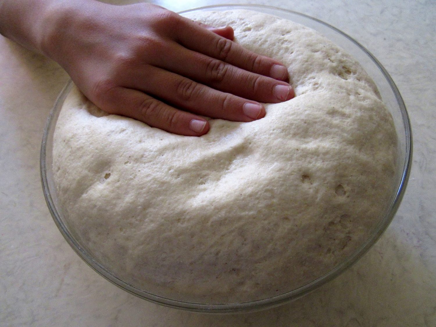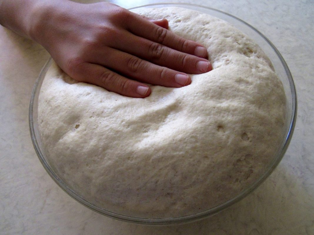 Después de dejar reposar la masa 1 hora y media sácala del bol y desgasifícala. Para desgasificar la masa colócala sobre una superficie enharinada y aprieta la masa desde el centro hacia afuera con las manos. También puedes hundir el puño en el centro de la masa para sacarle el aire y volver la masa a su volumen original.