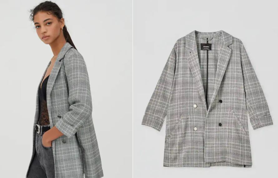 Otro de los innovadores diseños que nos trae Pull&Bear. Muy similar a la primera sobrecamisa que os hemos enseñado pero bastante más ligera. Este blazer a cuadros gris con mangas roll-up y cuello tipo esmoquin es sencillo y elegante. Perfecto para usar en una salida nocturna, una entrevista de trabajo o simplemente para dar un paseo. Se trata de una prenda muy versátil y moderna (a pesar de su estilo «vintage»).