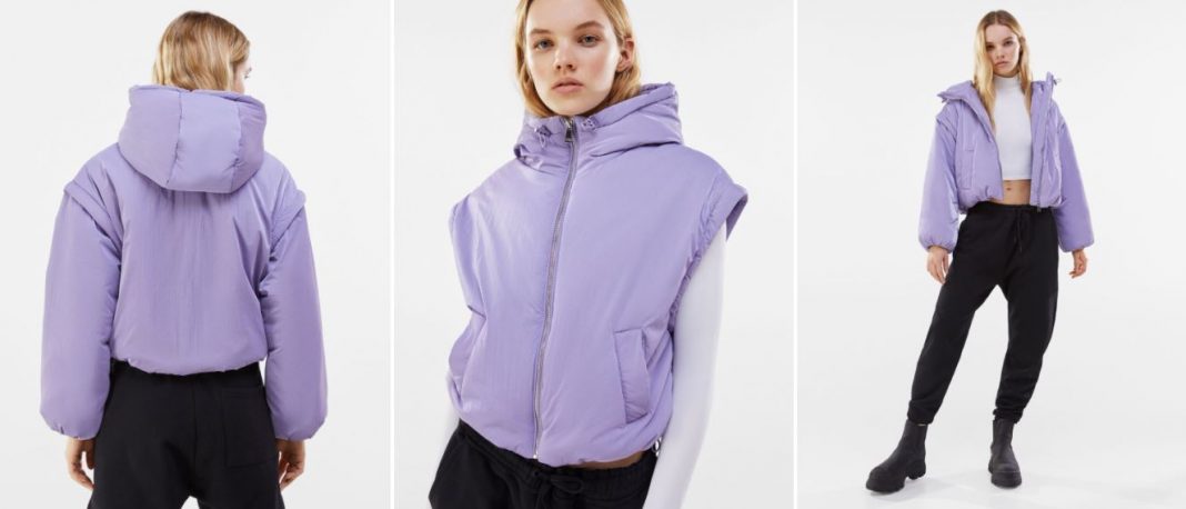 Todas las prendas que utilizamos deben ser, además de bonitas, prácticas y cómodas. Y esta cazadora morada de nylon Bershka sin dudas lo es. Su recubrimiento de poliuretano es perfecto para la lluvia. Gracias a sus mangas desmontables podrás utilizarla como chaqueta y también como chaleco. Su precio rebajado es 21,59 euros. Nada mal, ¿verdad? Tiene capucha y dos bolsillos delanteros con cremallera que los puedes utilizar para el móvil o para la cartera.