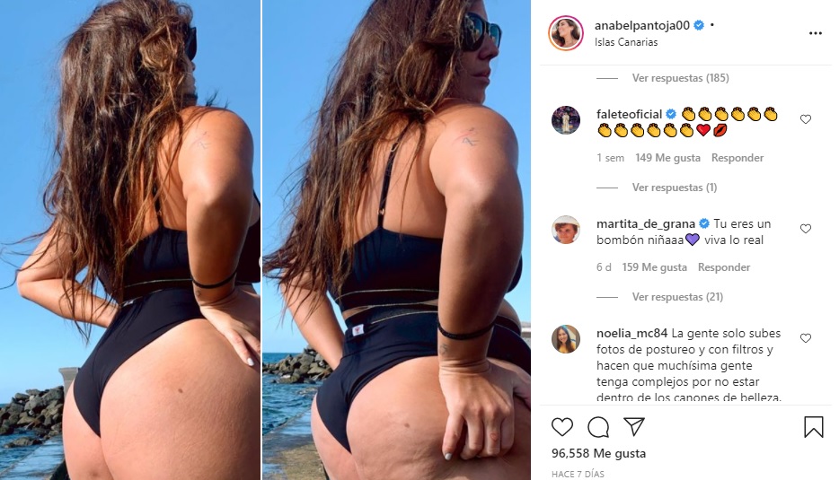 Ya son muchísimas las personas que se animan a mostrarse ante sus seguidores como son, sin filtros ni retoques. Anabel Pantoja es una de ellas. La sevillana suele compartir posados en bikini o ropa interior sin miedo alguno a que se le note la celulitis o algún kilito de más. Ella está muy feliz con su cuerpo y lo expresa cada vez que tiene la oportunidad. Poco le importan las críticas de los «haters». Estas son algunas de las fotos posteadas por Anabel que (injustamente) han generado controversia en redes.
