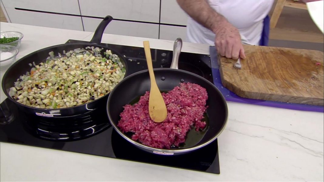 Una vez salpimentada, mete toda la carne picada de ternera en una sartén con aceite y cocina a fuego medio. Cuando ya esté casi hecha, añádela al recipiente donde se están rehogando las verduras. Echa también las alcaparras y una buena cantidad de tomate frito. Mezcla todo muy bien, retira del fuego y pásalo a una fuente apta para horno. Tira por encima un poco de queso rallado.