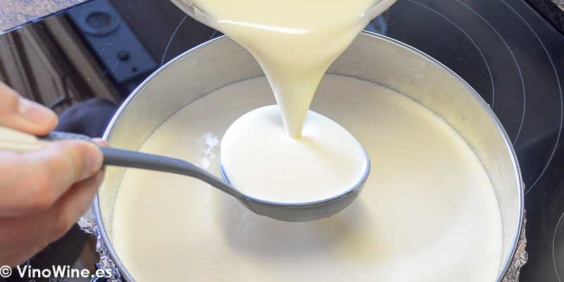 Lo primero que debes hacer es precalentar el horno a 200º. Luego comienzas con la mezcla. Para ella puedes utilizar varillas manuales, un batidor de mano tipo minipimer o Thermomix. Cualquiera de las tres es válida siempre y cuando procures que no entre aire en la preparación. Pon todo el queso crema en un bol y bate muy bien hasta que no quede ni un solo grumo. Luego añade el azúcar y continúa batiendo hasta que ambos ingredientes estén bien integrados. Si usas varilla manual 2 o 3 minutos es suficiente. Casca los huevos y ve agregándolos al recipiente de uno en uno. Incorpora la harina y sigue mezclando hasta lograr una masa homogénea. Por último echa la nata y vuelve a hacer el mismo procedimiento. Tu mezcla ya está lista.