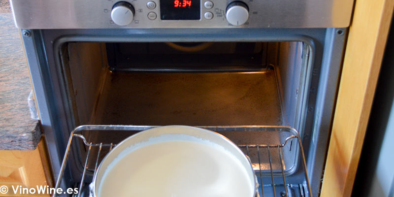 Coge un molde y cúbrelo en su totalidad con papel de horno. El papel tiene que sobresalir ya que con el calor la tarta subirá. Es decir, tienes que asegurarte que las paredes del molde queden bien recubiertas de papel. Una vez hecho esto vierte toda la mezcla en el recipiente. Coloca la fuente en la parte media del horno precalentado y déjalo unos 40 minutos aproximadamente. Si quieres una textura más compacta la puedes dejar más tiempo. Mientras se cocina ve vigilando. Si ves que queda muy dorada por arriba tapa con papel aluminio. Una vez pasado el tiempo de cocción, abre apenas la puerta del horno y deja que la tarta de queso se enfríe durante más de 5 minutos. Sácala del horno y ponla a enfriar a temperatura ambiente durante unas cuantas horas. Después guárdala en la nevera durante la noche (unas 12 horas más o menos). El gran secreto de esta tarta es que se debe comer bien fría. Así la sirve Rivera en La Viña.